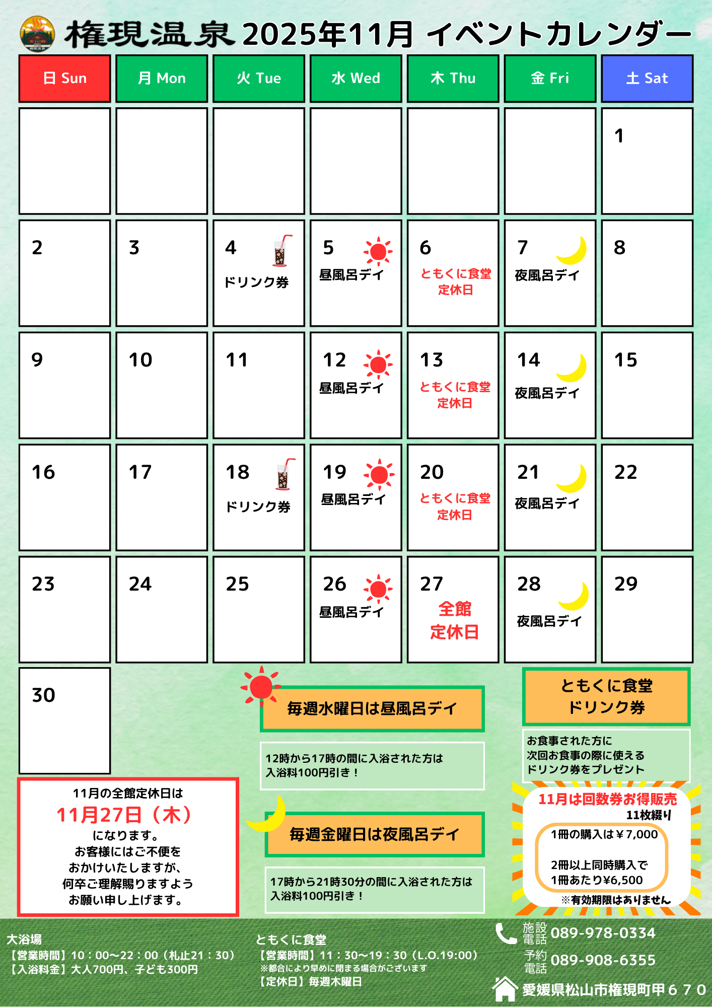 👉 通常7,000円(税込)の11枚つづり温泉回数券を、2冊以上同時購入で